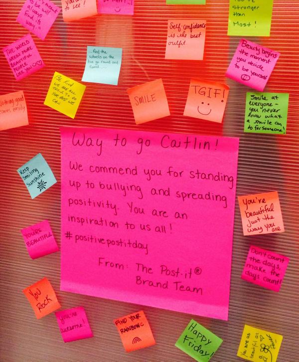 De stad waarin Caitlin woont, Alberta, bleek gelukkig veel meer steun te bieden dan George McDougall High School. Zo lanceerde Caitlin op 9 oktober een initiatief genaamd Positive Post-It Day, waarmee mensen worden aangemoedigd om anonieme positieve notes voor een ander achter te laten, met veel steun door Alberta. Of het pesten dankzij deze acties definitief zal ophouden, daar twijfelen we sterk aan, maar props voor het feit dat Caitlin dit project is aangegaan en zich juist niet heeft teruggetrokken!