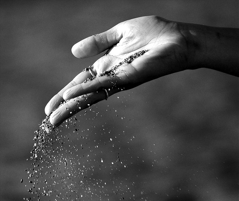 De moeder zweeg en dacht even na. Toen bukte ze zich en vulde elke hand met zand. Zo kwam zij bij haar dochter staan. Zonder verder iets te zeggen knelde zij de vingers van één hand steeds sterker om het zand. Het zand glipte tussen haar vingers door. Hoe krampachtiger ze haar hand balde, hoe sneller het zand er uit gleed. Toen zij haar hand opende kleefden er nog slechts enkele vochtige korrels aan haar handpalm. Haar andere hand had de moeder open gehouden als een kleine schaal. Daar bleven de zandkorrels liggen. Zij schitterden steeds heerlijker in het licht van de late avondzon.