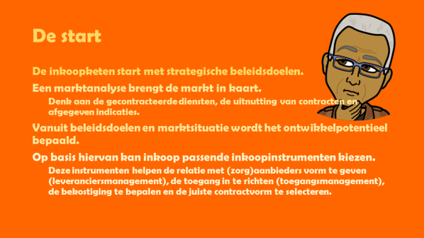 In het programma komen alle inkoopmethoden (aanbesteden, subsidie, open house) aan bod. Interactie tussen gemeente en aanbieder, bekeken vanuit beide kanten, is het uitgangspunt. Het gaat daarbij niet alleen over hoe de inkoop technisch vorm moet krijgen (kennis en informatie beschikbaar maken), maar juist ook over hoe partnerschap tussen gemeenten en aanbieders kan ontstaan (betere samenwerking). Daarnaast bekijkt het programma hoe ruimte ontstaat voor beleidsvrijheid zonder onnodige administratieve lasten (meer standaardisatie) en hoe inkoop bijdraagt aan de transformatie (door dit onderdeel te laten zijn van een continu leer- en verbeterproces).