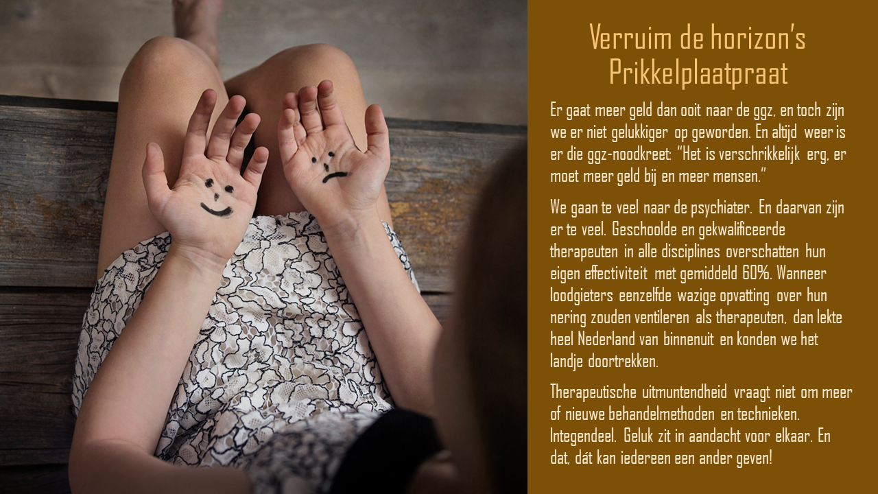 Therapeutische uitmuntendheid vraagt niet om meer of nieuwe behandelmethoden en technieken. Integendeel. Geluk zit in aandacht voor elkaar. En dat, dát kan iedereen een ander geven!