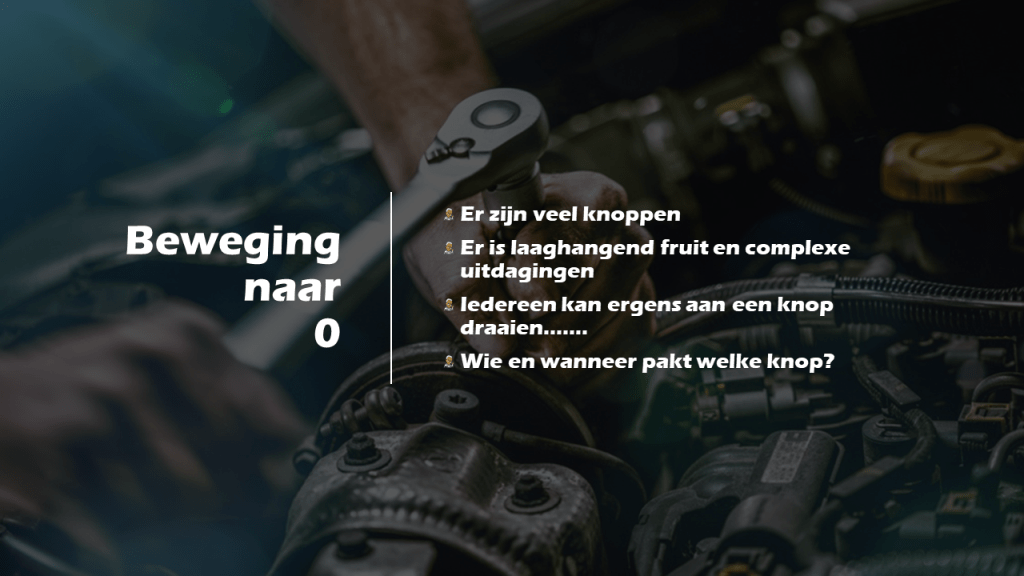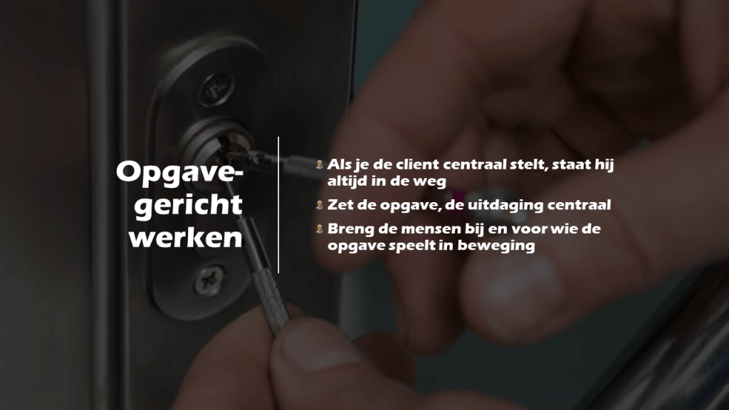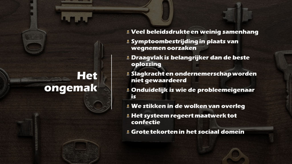 De binnen het sociaal domein gewenste en gevraagde omvorming vraagt om het wegnemen van de bestaande, onderliggende ordening en creëert een nieuwe orde. Dit vraagt een daarop afgestemde mentale instelling. Niks ‘de cliënt centraal’. Als je de cliënt centraal stelt, staat hij altijd in de weg! Zet de opgave, de uitdaging centraal. Breng de mensen bij en voor wie de opgave speelt in beweging. Op basis van heldere kaders, zoals de beweging “Van nu tot nul” dat bijvoorbeeld doet.
