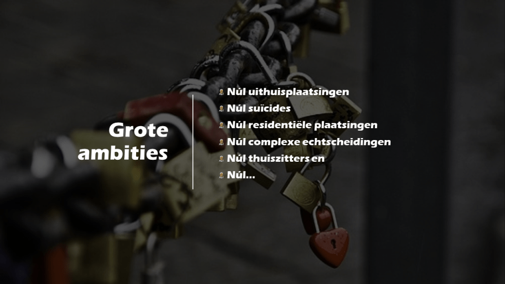 Durf te zeggen: “Geen kind meer de deur uit!” Dat dwingt om na te denken over wat er in het gezin of huishouden zélf nodig is om kinderen de veiligheid en ontwikkeling te bieden in hun meest belangrijke omgeving! Dat doe je, door elkaar te inspireren, uit te dagen en te helpen om binnen en buiten de kaders van onze systemen en producten opgavengericht te werken. Dat begint met de vraag “Wat heb je nodig?” Een vraag die geldt voor gezinnen, huishoudens én hulpverleners.