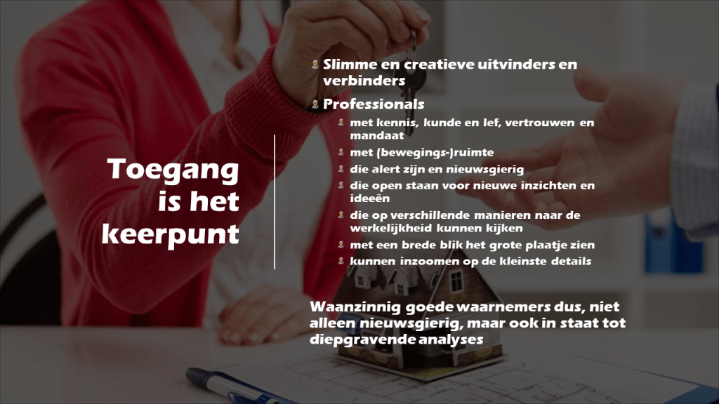 De sleutel voor deze verandering ligt bij de Toegang. Bemenst door professionals met kennis, kunde en lef. Met vertrouwen en mandaat ook. Met (bewegings-)ruimte om de juiste antwoorden te kunnen bieden. Met professionals die elkaar kunnen en mogen vinden. Met professionals die, als armoede en schulden, en de daarbij ontstane stress, belangrijke veroorzakers zijn van een slechte gezondheid (en andersom), de oorzaken mogen wegnemen, in plaats van de symptomen te bestrijden. Professionals die hoop kunnen bieden. Die de verwachting dat de toekomst positief zal uitvallen, ooit, straks, energie kunnen geven. Hoopbieders helpen daarbij. Ze maken de ander enthousiast om in actie te komen en stimuleren ieders inbreng en bijdrage daaraan. Het klinkt waanzinnig misschien. Maar is het waanzinniger dan de gedachte die we ooit hadden om ons niet langer met behulp van paarden, maar door middel van auto’s te verplaatsen? Of de droom om net als vogels de oceaan over te vliegen? Nee. Hoop bieden is de kracht van de juiste professionals. Het zijn slimme en creatieve uitvinders en verbinders, gebaseerd op een waanzinnig goede waarneming. Dat betekent bijvoorbeeld ook dat zij voortdurend open staan voor nieuwe inzichten en ideeën. Dat zij alert en nieuwsgierig zijn. Dat zij op verschillende manieren naar de werkelijkheid kunnen kijken, met een brede blik om het grote plaatje te zien, maar ook meteen weer inzoomend op de allerkleinste details.