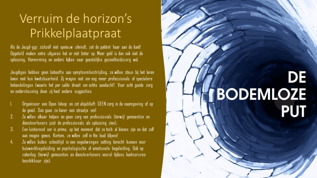 Als de Jeugd-ggz zichzelf niet opnieuw uitvindt, zet de patiënt haar aan de kant! Jeugdigen hebben geen behoefte aan symptoombestrijding, ze willen steun bij het leren leven met hun kwetsbaarheid. Zij vragen niet om nog meer professionals of specialere behandelingen (waarin het per saldo draait om echte aandacht! Voor echt goede zorg en ondersteuning doen zij heel andere suggesties: