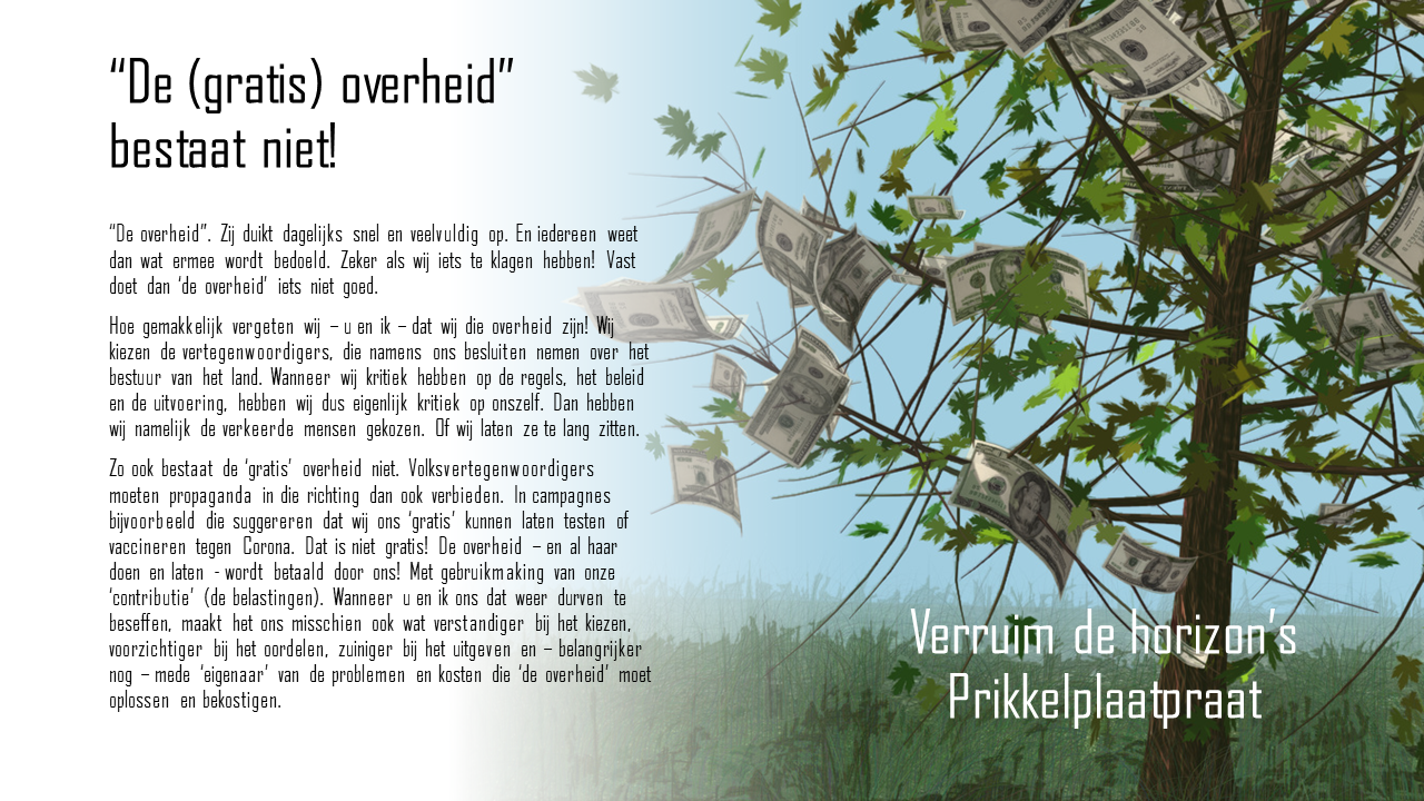 Zo ook bestaat de ‘gratis’ overheid niet. Volksvertegenwoordigers moeten propaganda in die richting dan ook verbieden. In campagnes bijvoorbeeld die suggereren dat wij ons ‘gratis’ kunnen laten testen of vaccineren tegen Corona. Dat is niet gratis! De overheid – en al haar doen en laten – wordt betaald door ons! Met gebruikmaking van onze ‘contributie’ (de belastingen). Wanneer u en ik ons dat weer durven te beseffen, maakt het ons misschien ook wat verstandiger bij het kiezen, voorzichtiger bij het oordelen, zuiniger bij het uitgeven en – belangrijker nog – mede ‘eigenaar’ van de problemen en kosten die ‘de overheid’ moet oplossen en bekostigen.
