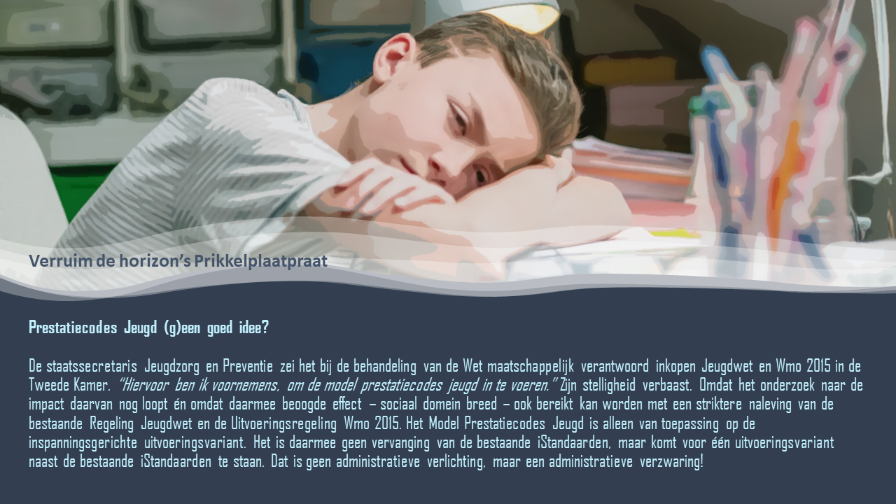 De staatssecretaris Jeugdzorg en Preventie zei het bij de behandeling van de Wet maatschappelijk verantwoord inkopen Jeugdwet en Wmo 2015 in de Tweede Kamer. “Hiervoor ben ik voornemens, om de model prestatiecodes jeugd in te voeren.” Zijn stelligheid verbaast. Omdat het onderzoek naar de impact daarvan nog loopt én omdat daarmee beoogde effect – sociaal domein breed – ook bereikt worden een striktere naleving van de bestaande Regeling Jeugdwet en de Uitvoeringsregeling Wmo 2015. Het Model Prestatiecodes Jeugd is alleen van toepassing op de inspanningsgerichte uitvoeringsvariant. Het is daarmee geen vervanging van de bestaande iStandaarden, maar komt voor één uitvoeringsvariant naast de bestaande iStandaarden te staan. Dat is geen administratieve verlichting, maar een administratieve verzwaring, zo leert de navolgende afweging.