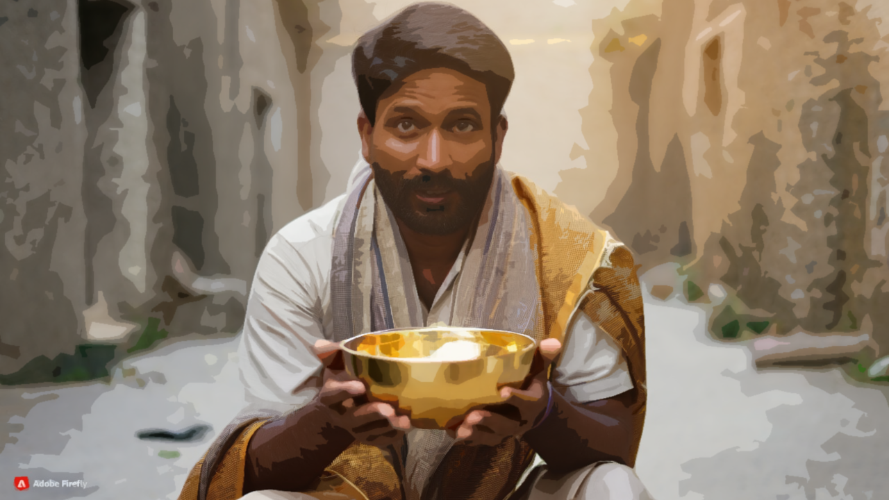 De wijze man greep in de diepe zak van zijn gewaad, haalde er een prachtig blinkende schaal tevoorschijn en vroeg de koning de schaal met goudstukken te vullen.