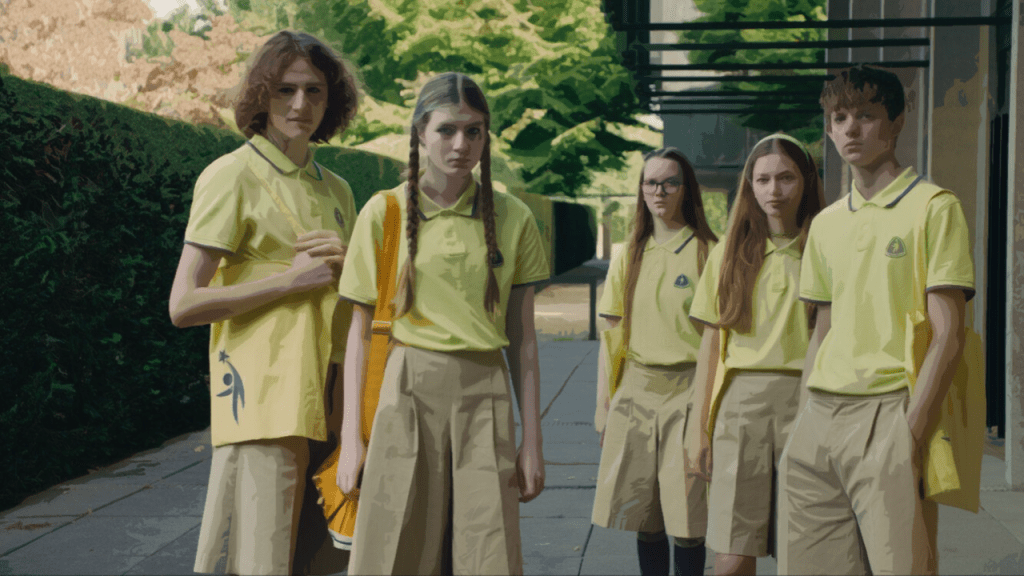 Jessica Hausner creëert een sinistere sfeer met contrasterende kleuren tegen een donkere achtergrond, waarbij een gong het gezang van miss Novak en haar pupillen versterkt.