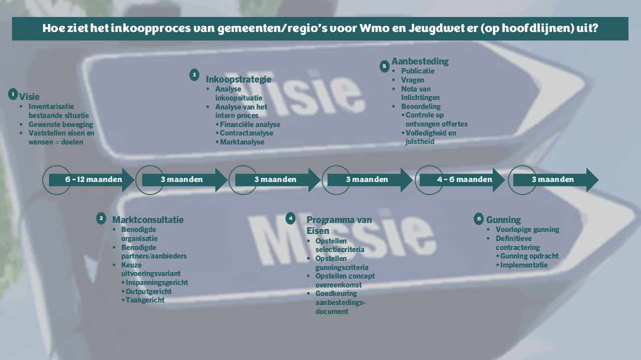 Het inkoopproces van gemeenten en regio’s is doorgaans complex, met een doorlooptijd van gemiddeld 18 maanden. Door te werken met een meerjarenvisie kunnen doelstellingen bij nieuwe aanbestedingen herijkt worden, wat het proces verkort. Gemeenten bepalen de meest geschikte contracteringsvorm: gaan zij voor een benadering waarbij de professional leidend is, of nemen zij zelf de verantwoordelijkheid in het organiseren van zorg?