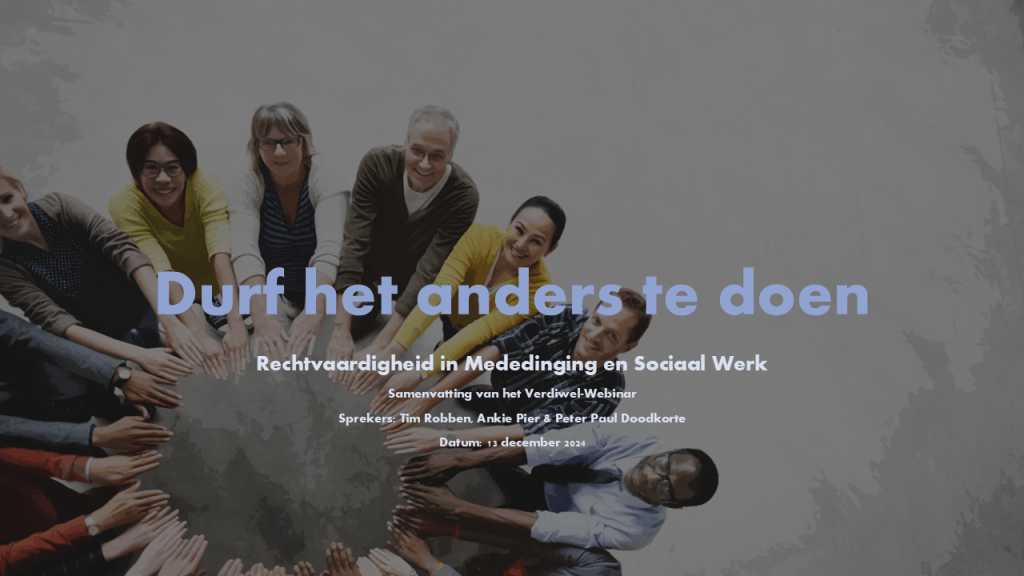 Het laatste Verdiwel-Webinar van het jaar stond in het teken van een belangrijk en actueel thema: de relatie tussen mededinging en sociaal werk. Tim Robben leidde het gesprek met Ankie Pier en Peter Paul Doodkorte over de vraag hoe rechtvaardigheid en mededinging zich verhouden tot de unieke dynamiek van het sociaal domein. De centrale vraag: Hoe kunnen we recht doen aan de aard van sociaal werk, binnen de juridische kaders van mededinging?