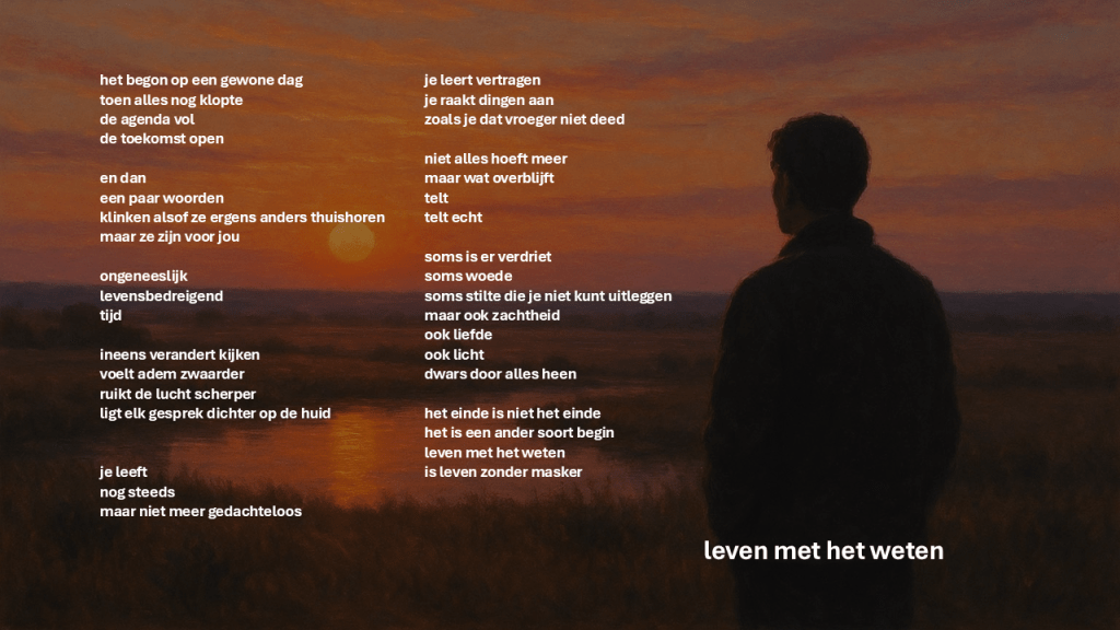 Leven met het weten vraagt om moed. Niet om stoerheid, maar om innerlijke eerlijkheid. Om toe te laten wat verdrietig is, zonder dat het je verlamt. Om te blijven liefhebben, zelfs als afscheid dichterbij komt. Om ruimte te geven aan hoop – niet op genezing misschien, maar op betekenis, op verbinding, op licht in donkere dagen.