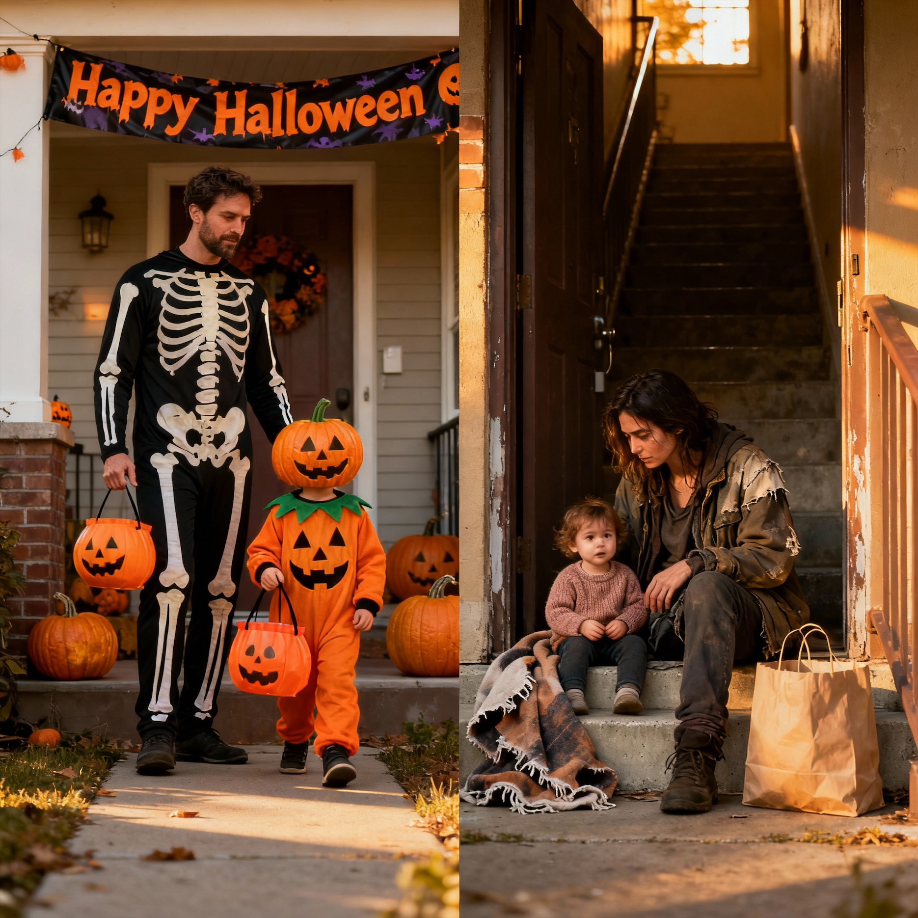 De lucht hing vol met de geur van pompoen en herfstbladeren. De maan scheen als een glimlach boven de daken toen vader en zoon, hand in hand, door de buurt liepen. Hun Halloweenavond was één groot feest geweest — niet om het griezelen, maar om het lachen.