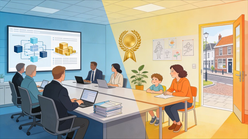 Daarna maakten we de sprong naar de praktijk: JEP Veendam. Waar beleidsstukken spreken over “transformatie”, laten zij zien hoe dat er in het echt uit kan zien. In samenwerking met de gemeente Veendam is gekozen voor een taakgerichte aanbesteding en een consortium van zes aanbieders dat onder één vlag – Jeugd Expertise Punt Veendam – de meest voorkomende ambulante jeugdhulp organiseert. In 2025 liggen de uitgaven voor ambulante jeugdhulp daar zo’n 10% onder het niveau van 2021, terwijl kwaliteit en toegankelijkheid juist zijn verbeterd. Een algemene voorziening, zonder indicatie of eigen bijdrage, brengt expertise naar voren: gedragswetenschappers en andere professionals zijn wekelijks aanwezig op school en bij de huisarts, waardoor 60% van de hulpvragen in een paar gesprekken wordt opgelost en kleine problemen klein blijven.