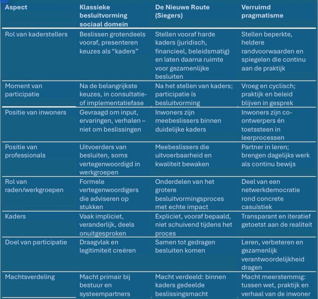 Om het verschil scherp te krijgen, helpt het om drie logica’s naast elkaar te zetten: de klassieke besluitvorming in het sociaal domein, de logica van De Nieuwe Route, en een verruimd pragmatisme.